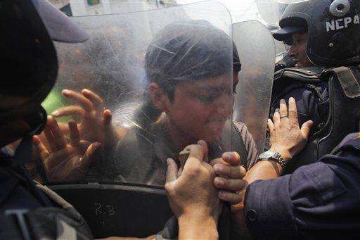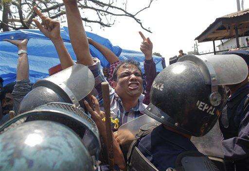 Nepalese protestors shout slogans against the government as they are stopped by police on the first anniversary of the devastating earthquake in Kathmandu, Nepal, Sunday, April 24, 2016. About 100 protesters scuffled with riot police outside the prime minister's office demonstrating against the slow reconstruction of the homes. More than 600,000 homes were destroyed and around 185,000 damaged in the quake. (AP Photo/Niranjan Shrestha)
