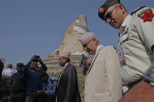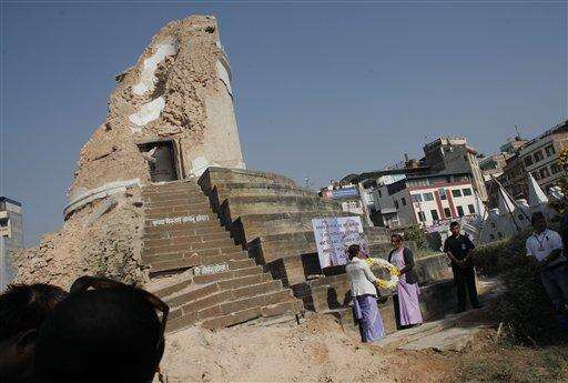 KATHMANDU, Nepal (AP) - People gathered Sunday at the remains of a historic tower in Nepal's capital that collapsed in a devastating earthquake a year ago, as Nepalese held memorial services to mark the anniversary of a disaster that killed nearly 9,000 people and left millions homeless.