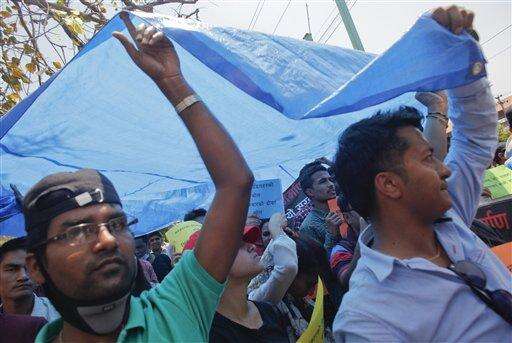 Nepalese people carry tarpaulin as they protest on the first anniversary of the devastating earthquake in Kathmandu, Nepal, Sunday, April 24, 2016. About 100 protesters scuffled with riot police outside the prime minister's office demonstrating against the slow reconstruction of the homes. More than 600,000 homes were destroyed and around 185,000 damaged in the quake. (AP Photo/Niranjan Shrestha)