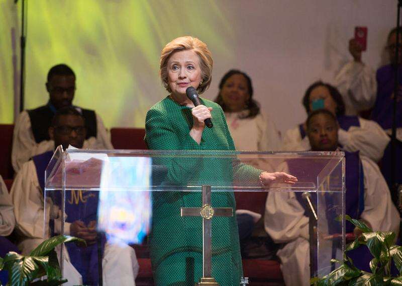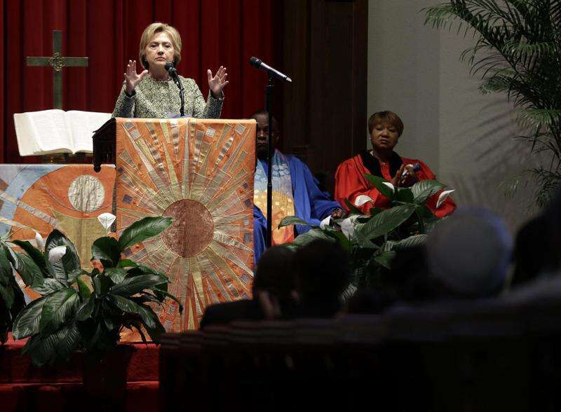 In this April 17, 2016, file photo, Democratic presidential candidate Hillary Clinton speaks at Grace Baptist Church in Mt. Vernon, N.Y. Black Baptist churches may not seem like an obvious match for Clinton, a white Methodist from the Chicago suburbs. But the Democratic presidential candidate, who has been criticized for her tentative or even awkward political skills, often seems most at ease in these churches where she has shared her faith for many years and earned a loyal following in the process. (AP Photo/Seth Wenig, File) The Associated Press