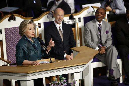 Democratic presidential candidate Hillary Clinton speaks Sunday, April 24, 2016, at the African Episcopal Church of St. Thomas in Philadelphia. (AP Photo/Matt Rourke) The Associated Press