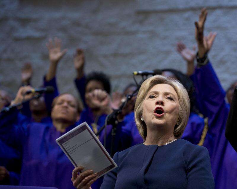 FILE - In this March 13, 2016, file photo, Democratic presidential candidate Hillary Clinton sings during service at Mount Zion Fellowship Church in Highland Hills, Ohio. Black Baptist churches may not seem like an obvious match for Clinton, a white Methodist from the Chicago suburbs. But the Democratic presidential candidate, who has been criticized for her tentative or even awkward political skills, often seems most at ease in these churches where she has shared her faith for many years and earned a loyal following in the process. (AP Photo/Carolyn Kaster, File) The Associated Press