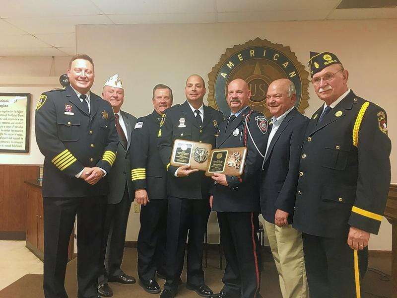 Elgin firefighter Jason Walczak and police Sgt. Chris Troiola were honored Tuesday night by American Legion Post 57 in a ceremony that also recognized longtime post members.