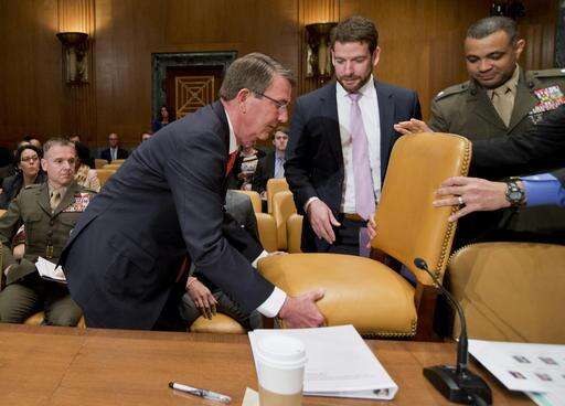 Defense Secretary Ash Carter, left, is assisted by his staff as they switch chairs before the start of a Senate Defense subcommittee hearing to review the fiscal 2017 Defense Department of Defense budget request, Wednesday, April 27, 2016, on Capitol Hill in Washington. (AP Photo/Manuel Balce Ceneta) The Associated Press