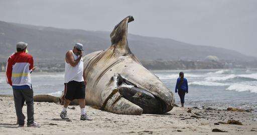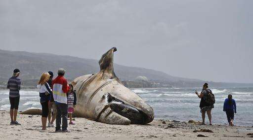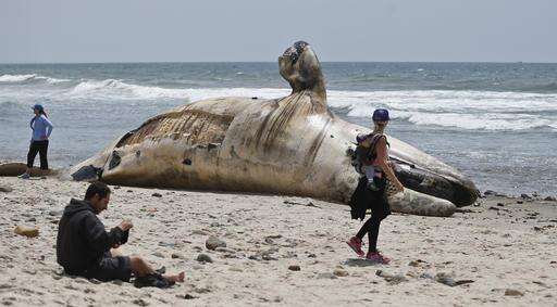 The massive carcass of a whale decomposes at a popular California surfing spot Tuesday, April 26, 2016, in San Clemente, Calif. Authorities are trying to decide what to do with the massive, rotting carcass. (AP Photo/Lenny Ignelzi)