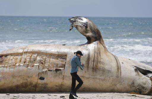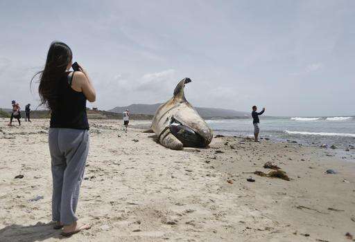 A woman takes a photo while another sight seer takes a selfie in front of the massive carcass of a whale at a popular California surfing spot Tuesday, April 26, 2016, in San Clemente, Calif. Authorities are trying to decide what to do with the massive, rotting carcass. (AP Photo/Lenny Ignelzi)