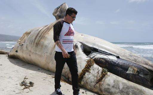 Heraclio Belmontes looks down at the mouth of a massive carcass of a whale at a popular California surfing spot Tuesday, April 26, 2016, in San Clemente, Calif. Authorities are trying to decide what to do with the massive, rotting carcass. (AP photos/Lenny Ignelzi)
