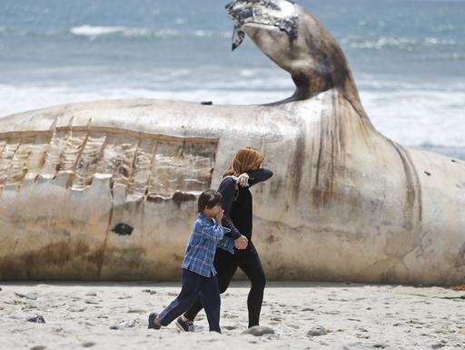 A woman and a young boy cover part of their noses as the walk past a massive carcass of a whale at a popular California surfing spot Tuesday, April 26, 2016, in San Clemente, Calif. Authorities are trying to decide what to do with the massive, rotting carcass. (AP Photo/Lenny Ignelzi)