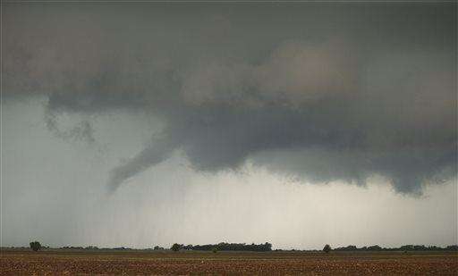 Storm clouds hang in the sky near Wellington, Kan., Tuesday, April 26, 2016. Thunderstorms bearing hail as big as grapefruit and winds approaching hurricane strength lashed portions of the Great Plains on Tuesday. (Travis Heying/The Wichita Eagle via AP) LOCAL TELEVISION OUT; MAGS OUT; LOCAL RADIO OUT; LOCAL INTERNET OUT; MANDATORY CREDIT The Associated Press