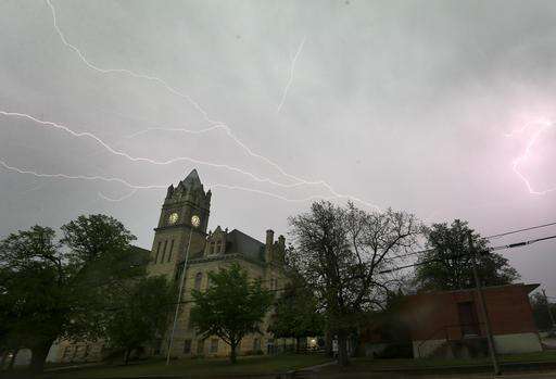 Lightning illuminates the sky over the Marion County Courthouse in Marion, Kan., Tuesday, April 26, 2016. Thunderstorms bearing hail as big as grapefruit and winds approaching hurricane strength lashed portions of the Great Plains on Tuesday. (AP Photo/Orlin Wagner) The Associated Press