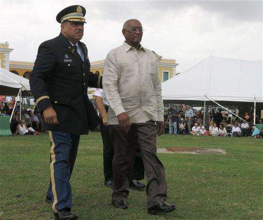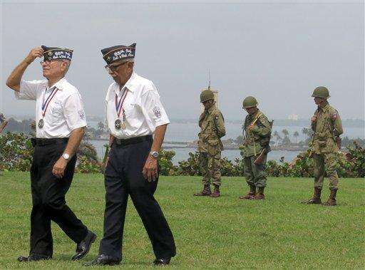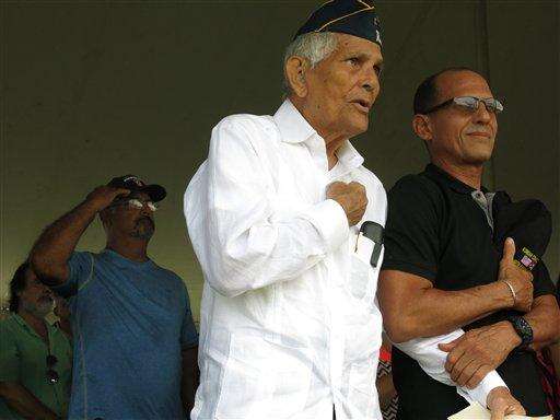 Puerto Rico war veterans walk during a ceremony to award them their Congressional Gold Medals at a ceremony in San Juan, Puerto Rico on Wednesday, April 27, 2016. The veterans were part of the 65th Infantry Regiment known as the Borinqueneers, which faced discrimination and was the last segregated unit in combat. (AP Photo/Danica Coto)