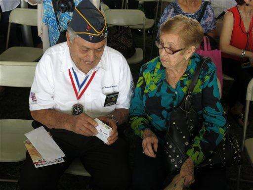 Puerto Rico war veterans await for their Congressional Gold Medal at a ceremony in San Juan, Puerto Rico on Wednesday, April 27, 2016. The veterans were part of the 65th Infantry Regiment known as the Borinqueneers, which faced discrimination and was the last segregated unit in combat. (AP Photo/Danica Coto)