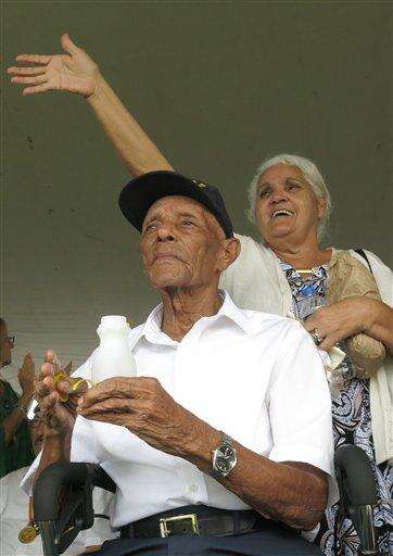 Puerto Rico war veteran Martin Morales, 104, celebrates with his daughter after receiving the Congressional Gold Medal at a ceremony in San Juan, Puerto Rico on Wednesday, April 27, 2016. Morales, who fought in World War II, is one of the oldest living Borinqueneer soldiers honored. "Sweet Mary, this has been good," he said. "I've had a happy day today." Morales was part of the 65th Infantry Regiment known as the Borinqueneers, which faced discrimination and was the last segregated unit in combat. (AP Photo/Danica Coto)