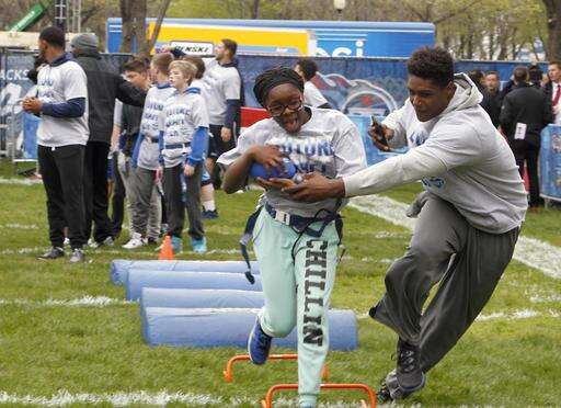 UCLA's Myles Jack, right, runs a drill with children during an NFL Play 60 event at Grant Park, Wednesday, April 27, 2016, in Chicago before Thursday's first round of the NFL football draft. (AP Photo/Kiichiro Sato) The Associated Press