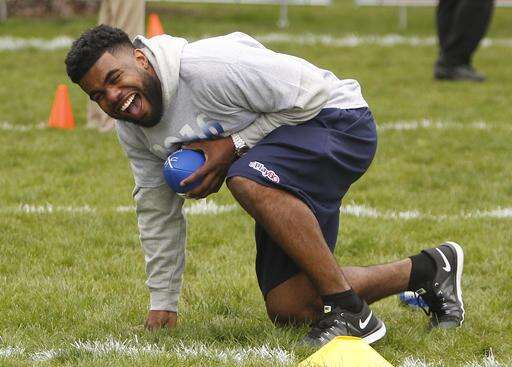 Ohio State's Ezekiel Elliott kneels as he laughs with other athletes during an NFL Play 60 event at Grant Park, Wednesday, April 27, 2016, in Chicago before Thursday's first round of the NFL football draft. (AP Photo/Kiichiro Sato) The Associated Press