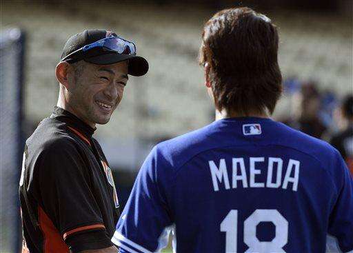 Miami Marlins' Ichiro Suzuki, left, of Japan talks with Los Angeles Dodgers' Kenta Maeda, of Japan, prior to a baseball game in Los Angeles, Monday, April 25, 2016. (AP Photo/Kelvin Kuo) The Associated Press