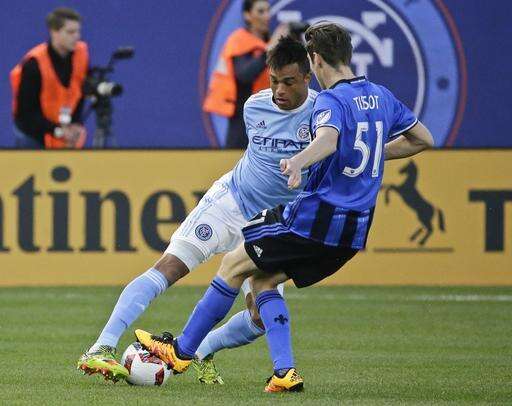 Montreal Impact's Maxim Tissot (51) and Ignacio Piatti (10) react to a call during the first half of an MLS soccer game against the New York City FC, Wednesday, April 27, 2016, at Yankee Stadium in New York. (AP Photo/Frank Franklin II)