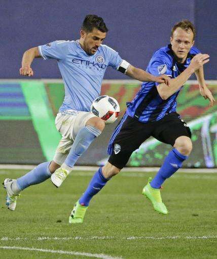 Montreal Impact's Wandrille Lefevre, right, defends New York City FC's David Villa during the first half of an MLS soccer game, Wednesday, April 27, 2016, at Yankee Stadium in New York. (AP Photo/Frank Franklin II)