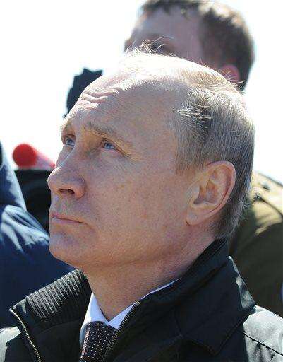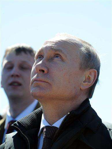 Russian President Vladimir Putin watches a launch of a Russian Soyuz 2.1a rocket carrying Lomonosov, Aist-2D and SamSat-218 satellites at the new Vostochny cosmodrome outside the city of Uglegorsk, about 200 kilometers (125 miles) from the city of Blagoveshchensk in the far eastern Amur region Thursday, April 28, 2016. (Mikhail Klimentyev/Sputnik, Kremlin Pool Photo via AP)