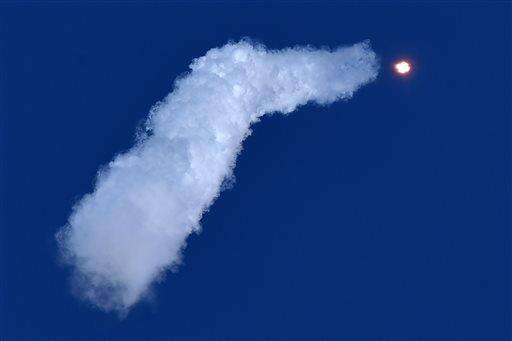 A Russian Soyuz 2.1a rocket carrying Lomonosov, Aist-2D and SamSat-218 satellites leaves a trail of smoke as it lifts off from the new Vostochny cosmodrome outside the city of Uglegorsk, about 200 kilometers (125 miles) from the city of Blagoveshchensk in the far eastern Amur region Thursday, April 28, 2016. (Kirill Kudryavtsev/Pool Photo via AP)