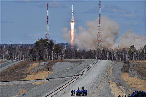 A Russian Soyuz 2.1a rocket carrying Lomonosov, Aist-2D and SamSat-218 satellites lifts off from the launch pad at the new Vostochny Cosmodrome outside the city of Uglegorsk, about 200 kilometers (125 miles) from the city of Blagoveshchensk in the far eastern Amur region Thursday, April 28, 2016. The launch of the first rocket from Russia's new space facility has been delayed after a last-minute problem. (Kirill Kudryavtsev/Pool Photo via AP)