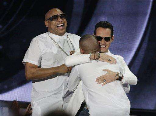 Singers Marc Anthony embraces Randy Martinez as Alexander Delgado smiles, left, after they won the Tropical Song of the Year, during the Latin Billboard Awards, Thursday, April 28, 2016 in Coral Gables, Fla. Delgado and Martinez make up the Cuban reggeaton duo Gente de Zona. (AP Photo/Wilfredo Lee)