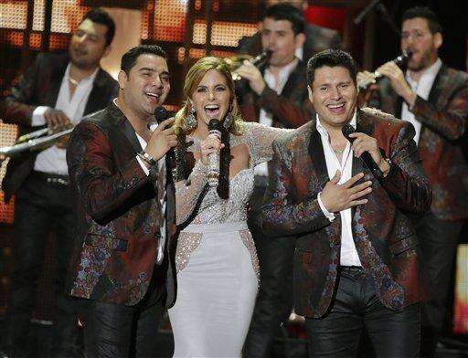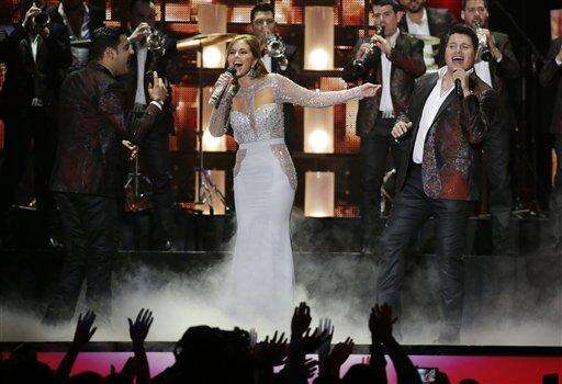 Singer Lucero, center, performs with the Banda Sinaloense MS de Sergio Lizarraga during the Latin Billboard Awards, Thursday, April 28, 2016 in Coral Gables, Fla. (AP Photo/Wilfredo Lee)