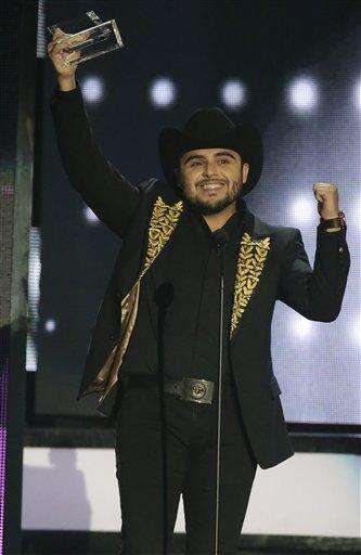 Singer Gerardo Ortiz raises the Regional Mexican Album of the Year award, during the Latin Billboard Awards, Thursday, April 28, 2016 in Coral Gables, Fla. (AP Photo/Wilfredo Lee)