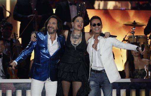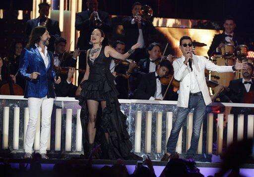 Singers Marco Antonio Solis, left, Natalia Jimenez and Marc Anthony, right, perform during the Latin Billboard Awards, Thursday, April 28, 2016 in Coral Gables, Fla. (AP Photo/Wilfredo Lee)