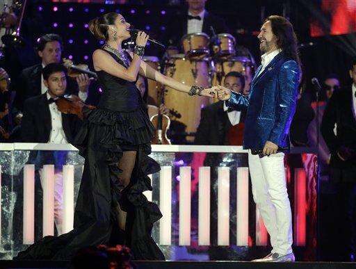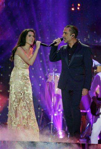Singers Marco Antonio Solis and Natalia Jimenez perform during the Latin Billboard Awards, Thursday, April 28, 2016 in Coral Gables, Fla. (AP Photo/Wilfredo Lee)