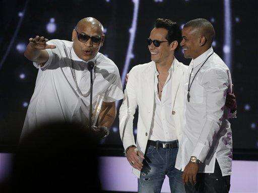 Singers Alexander Delgado, Marc Anthony and Randy Martinez receive the Tropical Song of the Year, during the Latin Billboard Awards, Thursday, April 28, 2016 in Coral Gables, Fla. Delgado and Martinez make up the Cuban reggeaton duo Gente de Zona. (AP Photo/Wilfredo Lee)