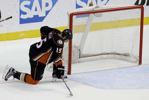 Anaheim Ducks center Ryan Getzlaf knees in front of an empty net after the Ducks' 2-1 loss to the Nashville Predators during Game 7 in an NHL hockey Stanley Cup playoffs first-round series in Anaheim, Calif., Wednesday, April 27, 2016. (AP Photo/Chris Carlson) The Associated Press