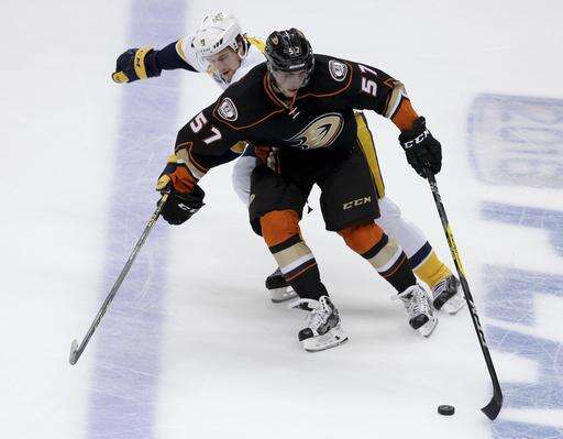 Anaheim Ducks left wing David Perron, right, battles Nashville Predators center Filip Forsberg for the puck during the second period of Game 7 in an NHL hockey Stanley Cup playoffs first-round series in Anaheim, Calif., Wednesday, April 27, 2016. (AP Photo/Chris Carlson) The Associated Press