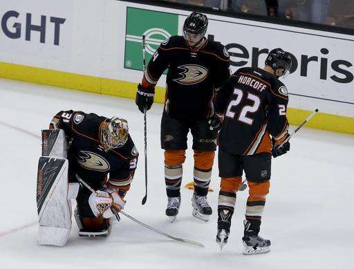 Anaheim Ducks goalie Frederik Andersen, left, reacts after the Ducks' 2-1 loss to the Nashville Predators as Shawn Horcoff, right, and Simon Despres stand nearby after Game 7 of an NHL hockey Stanley Cup playoffs first-round series in Anaheim, Calif., Wednesday, April 27, 2016. (AP Photo/Chris Carlson) The Associated Press