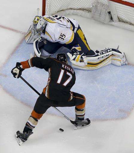 Nashville Predators goalie Pekka Rinne, top, blocks a shot by Anaheim Ducks center Ryan Kesler during the second period of Game 7 in an NHL hockey Stanley Cup playoffs first-round series in Anaheim, Calif., Wednesday, April 27, 2016. (AP Photo/Chris Carlson) The Associated Press