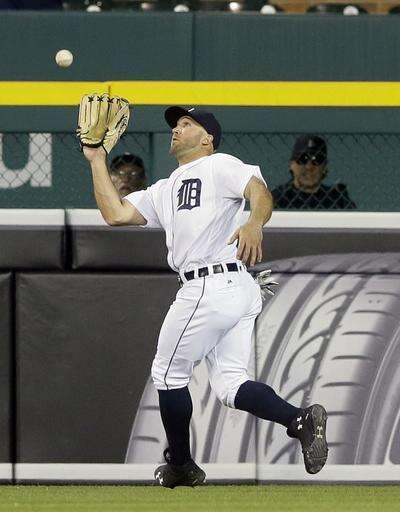 Detroit Tigers center fielder Tyler Collins catches a fly ball hit by Oakland Athletics' Chris Coghlan during the sixth inning of a baseball game, Monday, April 25, 2016 in Detroit. Collins directed an obscene gesture at fans after he lost a ball in the lights on a previous play in the inning which allowed the first run Tigers pitcher Jordan Zimmermann has given up this season. (AP Photo/Carlos Osorio) The Associated Press