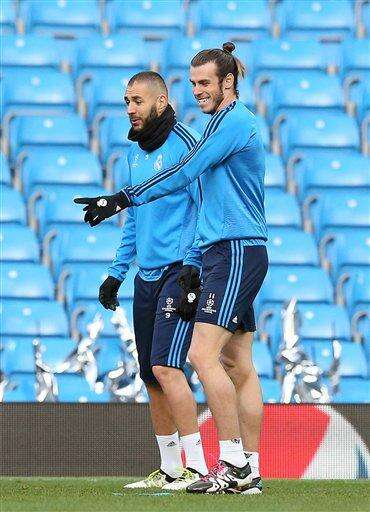 Real Madrid's Gareth Bale, right, laughs with Karim Benzema during a training session at the Etihad Stadium, Manchester, England, Monday, April 25, 2016. Real Madrid play Manchester City in a Champions League semi final soccer match on Tuesday, April 26. (Martin Rickett/PA via AP) UNITED KINGDOM OUT - NO SALES - NO ARCHIVES