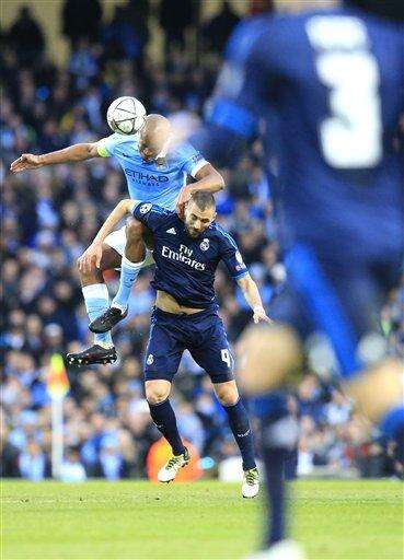 Real Madrid's Karim Benzema jumps for the ball with Manchester City's Vincent Kompany during the Champions League semifinal soccer match between Manchester City and Real Madrid, at the City of Manchester stadium in Manchester, England, Tuesday, April 26, 2016. (AP Photo/Jon Super)