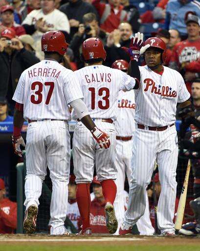 Philadelphia Phillies' Freddy Galvis, center, is greeted at home by Maikel Franco, left, and Odubel Herrera after hitting a two run home run off Cleveland Indians starting pitcher Trevor Bauer during the first inning of a baseball game, Saturday, April 30, 2016, in Philadelphia. (AP Photo/Derik Hamilton) The Associated Press
