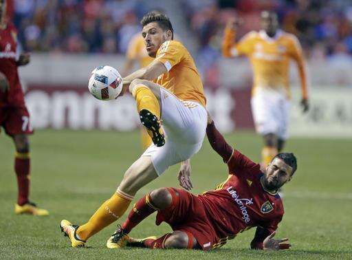 Houston Dynamo defender Agus (4) battles with Real Salt Lake midfielder Javier Morales (11) for the ball during the first half of an MLS soccer game Saturday, April 30, 2016, in Sandy, Utah. (AP Photo/Rick Bowmer)