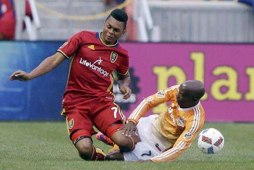 Real Salt Lake midfielder Jordan Allen, left, battles with Houston Dynamo midfielder DaMarcus Beasley, right, during the first half of an MLS soccer game Saturday, April 30, 2016, in Sandy, Utah. (AP Photo/Rick Bowmer)