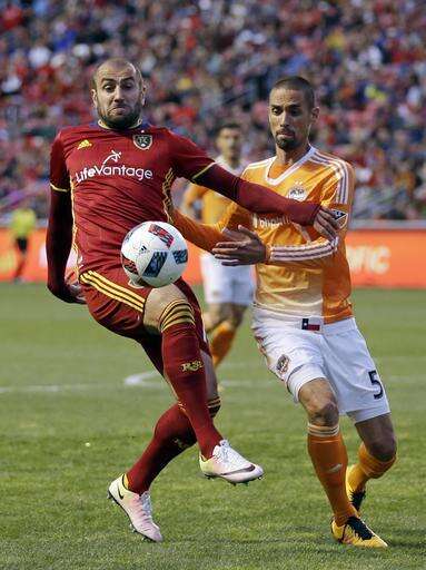 Real Salt Lake forward Yura Movsisyan, left, and Houston Dynamo defender Raul Rodriguez (5) battle for the ball during the first half of an MLS soccer game Saturday, April 30, 2016, in Sandy, Utah. (AP Photo/Rick Bowmer)