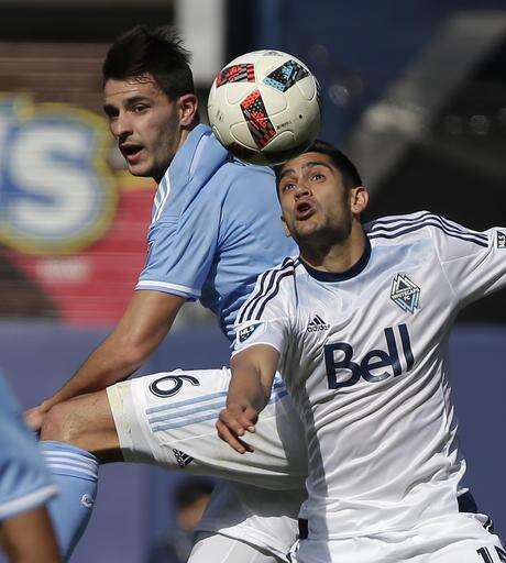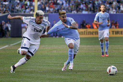 Vancouver Whitecaps midfielder Matias Laba, right, vies for the ball against New York City FC midfielder Federico Bravo (6) during the second half of an MLS soccer game, Saturday, April 30, 2016, in New York. NYCFC won 3-2. (AP Photo/Julie Jacobson) The Associated Press