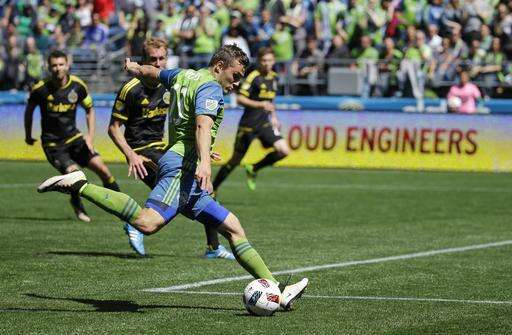 Seattle Sounders' Jordan Morris makes a shot on goal against the Columbus Crew in the second half of an MLS soccer match, Saturday, April 30, 2016, in Seattle. The Sounders beat the Crew 1-0. (AP Photo/Ted S. Warren) The Associated Press