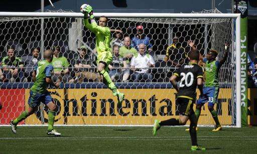 Seattle Sounders goalkeeper Stefan Frei, second from left, leaps for the ball in the second half of an MLS soccer match against the Columbus Crew, Saturday, April 30, 2016, in Seattle. The Sounders beat the Crew 1-0. (AP Photo/Ted S. Warren) The Associated Press