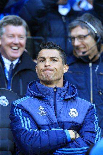 Real Madrid's Cristiano Ronaldo watches the math at the bench during the Champions League semifinal soccer match between Manchester City and Real Madrid, at the City of Manchester stadium in Manchester, England, Tuesday, April 26, 2016. (AP Photo/Jon Super) The Associated Press