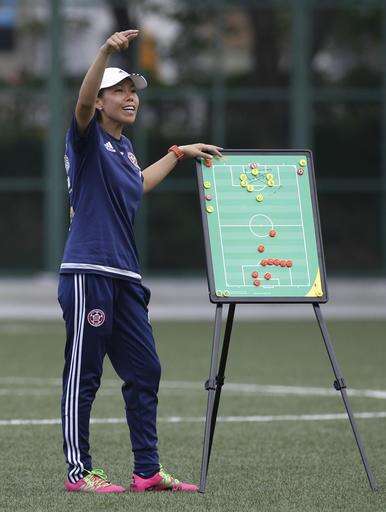 Eastern Sports Club head coach Chan Yuen-ting, left, attends a training session in Hong Kong, Friday, May 6, 2016. At age 27, Chan is younger than several of the players she coaches at Eastern Sports Club yet she has already secured a unique place for herself in soccer history by becoming the first woman to lead a men's team to a top-division national championship. Chan took charge at Eastern in December, with the club not having won the Hong Kong league for 21 years, and last month the team clinched that elusive title and made their female coach the talk of the town. (AP Photo/Kin Cheung)