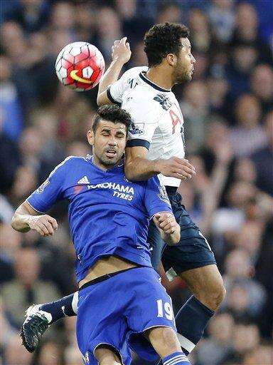 Chelsea's Diego Costa, below, vies for the ball withTottenham's Mousa Dembele during the English Premier League soccer match between Chelsea and Tottenham Hotspur at Stamford Bridge stadium in London, Monday, May 2, 2016. (AP Photo/Frank Augstein) The Associated Press