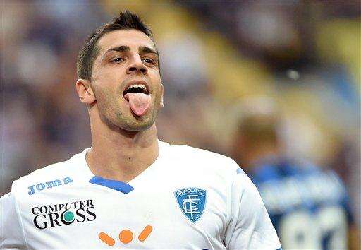 Empoli's forward Manuel Pucciarelli celebrates after scoring during a e Serie A soccer match between Inter Milan and Empoli at the Giuseppe Meazza stadium in Milan, Italy, Saturday, May 7, 2016. (Daniel Dal Zennaro/ANSA via AP) The Associated Press