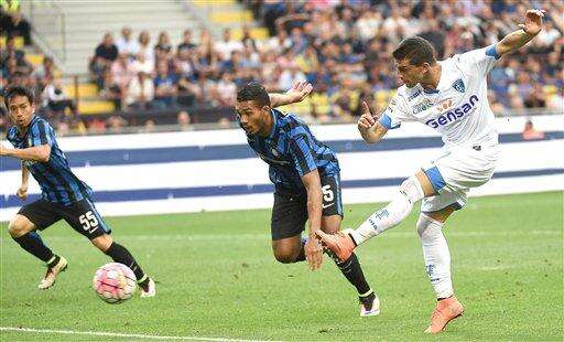 Empoli's forward Manuel Pucciarelli, right, scores during a e Serie A soccer match between Inter Milan and Empoli at the Giuseppe Meazza stadium in Milan, Italy, Saturday, May 7, 2016. (Daniel Dal Zennaro/ANSA via AP) The Associated Press